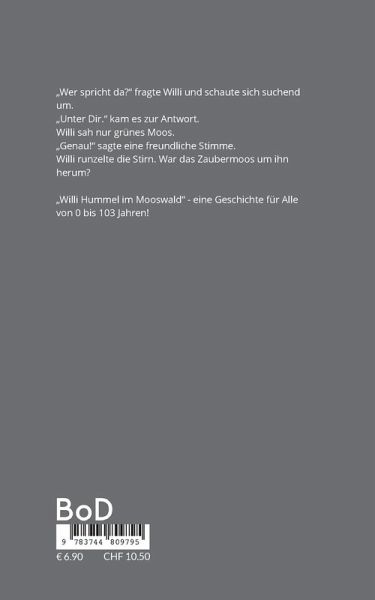 Wer spricht da? fragte Willi und schaute sich suchend um.Unter Dir. kam es zur Antwort.Willi sah nur grünes Moos.Genau! sagte eine freundliche Stimme.Willi runzelte die Stirn. War das Zaubermoos um ihn herum?Willi Hummel im Mooswald - eine Geschichte für Alle von 0 bis 103 Jahren.
