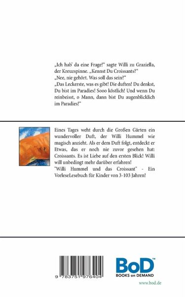 Ich hab' da eine Frage! sagte Willi zu Graziella, der Kreuzspinne. Kennst Du Croissants?Nee, nie gehört. Was soll das sein?Das Leckerste, was es gibt! Die duften! Du denkst, Du bist im Paradies! Sooo köstlich! Und wenn Du reinbeisst, o Mann, dann bist Du augenblicklich im Paradies!Eines Tages weht durch die Großen Gärten ein wundervoller Duft, der Willi Hummel wie magisch anzieht. Als er dem Duft folgt, entdeckt er Etwas, das er noch nie zuvor gesehen hat: Croissants.Es ist Liebe auf den ersten Blick! Willi will unbedingt mehr darüber erfahren!Willi Hummel und das Croissant. Ein VorleseLesebuch für Kinder von 3 bis 103 Jahren!