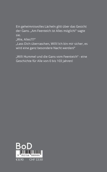 Ein geheimnisvolles Lächeln glitt über das Gesicht der Gans. Am Feenteich ist Alles möglich! sagte sie.Wie, Alles???Lass Dich überraschen, Willi! Ich bin mir sicher, eswird eine ganz besondere Nacht werden!Willi Hummel und die Gans vom Feenteich - eine Geschichte für Alle von 0 bis 103 Jahren!
