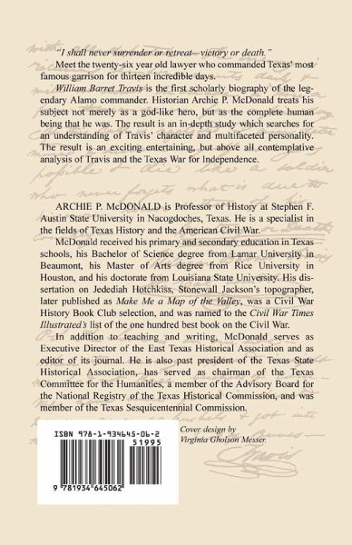 Meet the twenty-six year old lawyer who commanded Texas' most famous garrison for thirteen incredible days and penned the words, "I shall never retreat or surrender-victory or death." William Barrett Travis is the first scholarly biography of the legendary Alamo commander. Historian Archie P. McDonald treats his subject not merely as a god-like hero, but as the complete human being that he was. The result is an in-depth study that searches for an understanding of Travis' character and multifaceted personality. The result is an exciting and entertaining, but above all contemplative analysis of Travis and the Texas War for Independence.