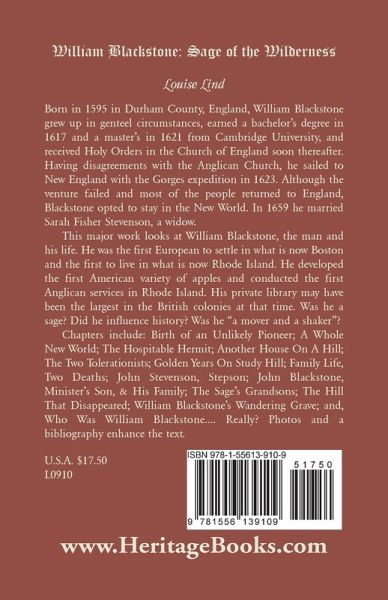 orn in 1595 in Durham County, England, William Blackstone grew up in genteel circumstances, earned a bachelor’s degree in 1617 and a master’s in 1621 from Cambridge University, and received Holy Orders in the Church of England soon thereafter. Having disagreements with the Anglican Church, he sailed to New England with the Gorges expedition in 1623. Although the venture failed and most of the people returned to England, Blackstone opted to stay in the New World. In 1659 he married Sarah Fisher Stevenson, a widow. This major work looks at William Blackstone, the man and his life. He was the first European to settle in what is now Boston and the first to live in what is now Rhode Island. He developed the first American variety of apples and conducted the first Anglican services in Rhode Island. His private library may have been the largest in the British colonies at that time. Was he a sage? Did he influence history? Was he "a mover and a shaker"? Chapters include: Birth of an Unlikely Pioneer; A Whole New World; The Hospitable Hermit; Another House On A Hill; The Two Tolerationists; Golden Years On Study Hill; Family Life, Two Deaths; John Stevenson, Stepson; John Blackstone, Minister’s Son, & His Family; The Sage’s Grandsons; The Hill That Disappeared; William Blackstone’s Wandering Grave; and, Who Was William Blackstone.... Really? Photos and a bibliography enhance the text.