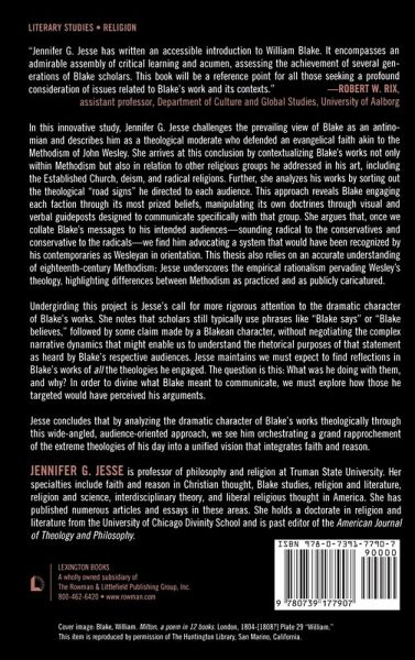 In this innovative study, Jesse challenges the prevailing view of Blake as an antinomian and describes him as a theological moderate who defended an evangelical faith akin to the Methodism of John Wesley. She arrives at this conclusion by contextualizing Blake's works not only within Methodism, but in relation to other religious groups he addressed in his art, including the Established Church, deism, and radical religions. Further, she analyzes his works by sorting out the theological "road signs" he directed to each audience. This approach reveals Blake engaging each faction through its most prized beliefs, manipulating its own doctrines through visual and verbal guide-posts designed to communicate specifically with that group. She argues that, once we collate Blake's messages to his intended audiences-sounding radical to the conservatives and conservative to the radicals-we find him advocating a system that would have been recognized by his contemporaries as Wesleyan in orientation. This thesis also relies on an accurate understanding of eighteenth-century Methodism: Jesse underscores the empirical rationalism pervading Wesley's theology, highlighting differences between Methodism as practiced and as publicly caricatured. Undergirding this project is Jesse's call for more rigorous attention to the dramatic character of Blake's works. She notes that scholars still typically use phrases like "Blake says" or "Blake believes," followed by some claim made by a Blakean character, without negotiating the complex narrative dynamics that might enable us to understand the rhetorical purposes of that statement, as heard by Blake's respective audiences. Jesse maintains we must expect to find reflections in Blake's works of all the theologies he engaged. The question is: what was he doing with them, and why? In order to divine what Blake meant to communicate, we must explore how those he targeted would have perceived his arguments. Jesse concludes that by analyzing the dramatic character of Blake's works theologically through this wide-angled, audience-oriented approach, we see him orchestrating a grand rapprochement of the extreme theologies of his day into a unified vision that integrates faith and reason.