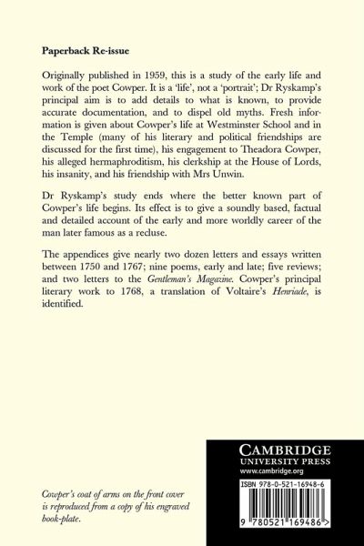 This 1959 book is a study of the early life and work of the poet William Cowper. It is a 'life', not a 'portrait'; Dr Ryskamps's principal aim was to add details to what was known, to provide accurate documentation, and to dispel old myths. Information is given about Cowper's life at Westminster School and in the Temple, his engagement to Theadora Cowper, his alleged hermaphroditism, his clerkship at the House of Lords, his insanity, and his friendship with Mrs Unwin. Dr Ryskamp's study ends where the better-known part of Cowper's life begins. Its effect is to give a soundly based, factual and detailed account of the early and more worldly career of the man later famous as a recluse. The appendices give nearly two dozen letters and essays written between 1750 and 1767; nine poems, early and late; five reviews; and two letters to the Gentleman's Magazine.