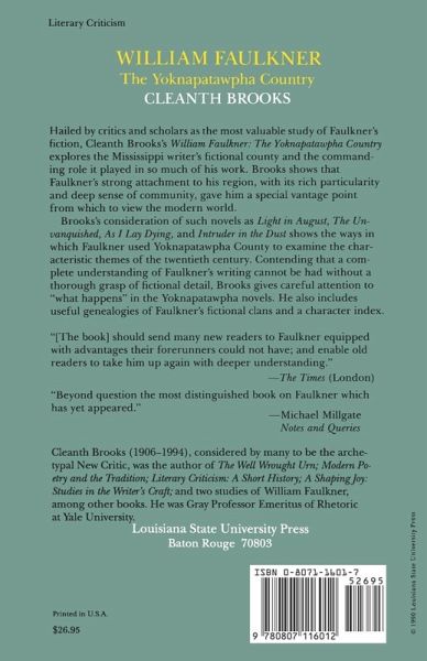 Hailed by critics and scholars as the most valuable study of Faulkner's fiction, Cleanth Brooks's William Faulkner: The Yoknapatawpha Country explores the Mississippi writer's fictional county and the commanding role it played in so much of his work. Brooks shows that Faulkner's strong attachment to his region, with its rich particularity and deep sense of community, gave him a special vantage point from which to view the modern world. Brooks's consideration of such novels as Light in August, The Unvanquished, As I Lay Dying, and Intruder in the Dust shows the ways in which Faulkner used Yoknapatawpha County to examine the characteristic themes of the twentieth century. Contending that a complete understanding of Faulkner's writing cannot be had without a thorough grasp of fictional detail, Brooks gives careful attention to "what happens: In the Yoknapatawpha novels. He also includes useful genealogies of Faulkner's fictional clans and a character index.