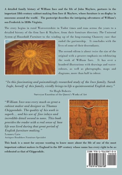 A detailed family history of William Ince and the life of John Mayhew, partners in the important 18th century cabinet making firm Ince & Mayhew. Their antique furniture is on display in a number of museums and stately homes around the world. The postscript describes the intriguing adventures of William's son in 1830s Virginia. 'A fascinating and painstakingly researched study' Sir Hugh Roberts. 'An absolutely fascinating book providing the reader with a real sense of how life was lived during that great period of English furniture making.' Lennox Cato, Antiques Roadshow Furniture Specialist The story covers:rural Worcestershire in Tudor times court cases in the Star Chamber of James 1 of England plague and Civil War in a Worcestershire village ancient deeds and indentures emigration to London Ince & Mayhew: the lives of William Ince and John Mayhew and their exquisite work the lives of the Ince women across the generations The detailed history of the firm Ince & Mayhew starts with their furniture directory The Universal System of Household Furniture and goes through to the winding up of the long-running Chancery case that ended their partnership. The lives of both William Ince and John Mayhew convey the riches that could be enjoyed by the combination of talent and entrepreneurship, but also the hardship that had to be endured in the conditions of their time. A brief look at their descendants touches on diverse topics, including:the ending of slavery in Jamaica the proposed Pyramid Cemetery for London two renowned American actors the artist Joseph Murray Ince the journalist and social researcher Henry Mayhew The second editon is about twice the size of the original with a greater emphasis on celebrating the work of William Ince. It also includes new information on his father and sisters in Worcestershire, his wife's family in London and the intriguing adventures of William's son Frederick in America linked to the struggles of his long-suffering wife Martha de Bar in England, taken from Frederick's papers written between 1824 and 1836. There is a chapter on John Mayhew and his family, including new research on John's baptism and his siblings, and information about his children and grandchildren. There is also information on some of William's more notable descendants, including the colourful actress Annette Ince, who played Juliet to John Wilkes Booth's Romeo and the artists Joseph Murray Ince, Charles Percy Ince and Charlotte Grace Cowell. The book has over a hundred illustrations with drawings and water-colours, as well as photographs, maps and diagrams, more than half in colour. This book is a must for anyone wanting to know more about the life of one of the most important cabinet makers in England in the 18th century whose name has every right to be as celebrated as that of Chippendale.