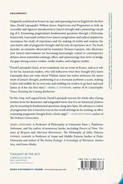 Originally published in French in 1997 and appearing here in English for the first time, David Lapoujade's William James: Empiricism and Pragmatism is both an accessible and rigorous introduction to James's thought and a pioneering rereading of it. Examining pragmatism's fundamental questions through a Deleuzian framework, Lapoujade outlines how James's pragmatism and radical empiricism encompass the study of experience and the making of reality, and he reopens the speculative side of pragmatist thought and the role of experience in it. The book includes an extensive afterword by translator Thomas Lamarre, who illustrates how James's interventions are becoming increasingly central to the contemporary debates about materialist ontology, affect, and epistemology that strive to bridge the gaps among science studies, media studies, and religious studies.