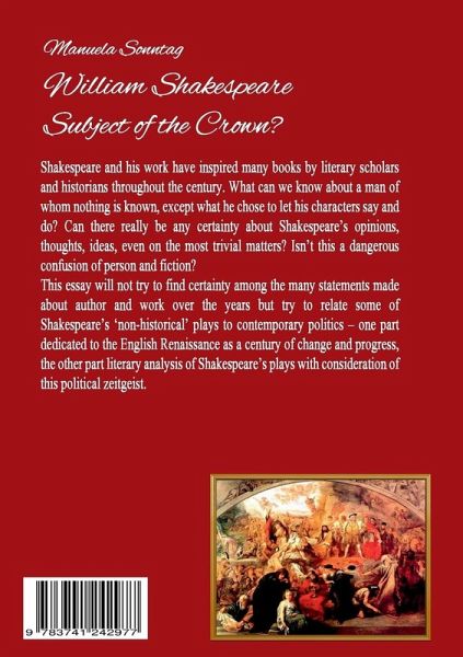 Shakespeare and his work have inspired many books by literary scholars and historians throughout the century. What can we know about a man of whom nothing is known, except what he chose to let his characters say and do? Can there really be any certainty about Shakespeare's opinions, thoughts, ideas, even on the most trivial matters? Isn't this a dangerous confusion of person and fiction?This essay will not try to find certainty among the many statements made about author and work over the years but try to relate some of Shakespeare's 'non-historical' plays to contemporary politics - one part dedicated to the English Renaissance as a century of change and progress, the other part literary analysis of Shakespeare's plays with consideration of this political zeitgeist. Shakespeare and his work have inspired many books by literary scholars and historians throughout the century. What can we know about a man of whom nothing is known, except what he chose to let his characters say and do? Can there really be any certainty about Shakespeare's opinions, thoughts, ideas, even on the most trivial matters? Isn't this a dangerous confusion of person and fiction?This essay will not try to find certainty among the many statements made about author and work over the years but try to relate some of Shakespeare's 'non-historical' plays to contemporary politics - one part dedicated to the English Renaissance as a century of change and progress, the other part literary analysis of Shakespeare's plays with consideration of this political zeitgeist.