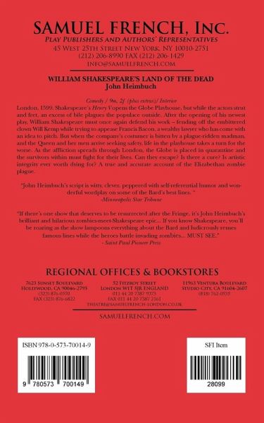 Genre: Comedy Characters: 9 males, 2 females (plus extras) Scenery: Interior Described as "a true and accurate account of the 1599 zombie invasion at the Globe Theatre," William Shakespeare's Land of the Dead explores the Elizabethan era of Shakespeare, Francis Bacon and Queen Elizabeth, all of whom are struggling to survive a zombie attack! In the midst of an argument in which Will Kemp is thrown out of the theater for refusing to acknowledge Falstaff's death in H