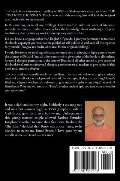 This book is an easy-to-read retelling of William Shakespeare's classic romance THE TWO NOBLE KINSMEN. People who read this retelling first will find the orinal play much easier to understand. In this retelling, as in all my retellings, I have tried to make the work of literature accessible to modern readers who may lack the knowledge about mythology, religion, and history that the literary work's contemporary audience had. Do you know a language other than English? If you do, I give you permission to translate this book, copyright your translation, publish or self-publish it, and keep all the royalties for yourself. (Do give me credit, of course, for the original retelling.) I would like to see my retellings of classic literature used in schools, so I give permission to the country of Finland (and all other countries) to give copies of this book to all students forever. I also give permission to the state of Texas (and all other states) to give copies of this book to all students forever. I also give permission to all teachers to give copies of this book to all students forever. Teachers need not actually teach my retellings. Teachers are welcome to give students copies of my eBooks as background material. For example, if they are teaching Homer's Iliad and Odyssey, teachers are welcome to give students copies of my Virgil's Aeneid: A Retelling in Prose and tell students, "Here's another ancient epic you may want to read in your spare time."
