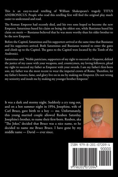 This is an easy-to-read retelling of William Shakespeare's "Titus Andronicus." People who read this retelling first will find the original play much easier to understand and read. Do you know a language other than English? If you do, I give you permission to translate this book, copyright your translation, publish or self-publish it, and keep all the royalties for yourself. (Do give me credit, of course, for the original retelling.) I would like to see my retellings of classic literature used in schools, so I give permission to the country of Finland (and all other countries) to give copies of this book to all students forever. I also give permission to the state of Texas (and all other states) to give copies of this book to all students forever. I also give permission to all teachers to give copies of this book to all students forever. Teachers need not actually teach my retellings. Teachers are welcome to give students copies of my eBooks as background material. For example, if they are teaching Homer's Iliad and Odyssey, teachers are welcome to give students copies of my Virgil's Aeneid: A Retelling in Prose and tell students, "Here's another ancient epic you may want to read in your spare time."
