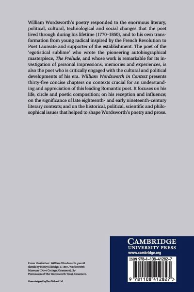 William Wordsworth's poetry responded to the enormous literary, political, cultural, technological and social changes that the poet lived through during his lifetime (1770¿1850), and to his own transformation from young radical inspired by the French Revolution to Poet Laureate and supporter of the establishment. The poet of the 'egotistical sublime' who wrote the pioneering autobiographical masterpiece, The Prelude, and whose work is remarkable for its investigation of personal impressions, memories and experiences, is also the poet who is critically engaged with the cultural and political developments of his era. William Wordsworth in Context presents thirty-five concise chapters on contexts crucial for an understanding and appreciation of this leading Romantic poet. It focuses on his life, circle, and composition; on his reception and influence; on the significance of late-eighteenth and early-nineteenth century literary contexts; and on the historical, political, scientific and philosophical issues that helped to shape Wordsworth's poetry and prose.