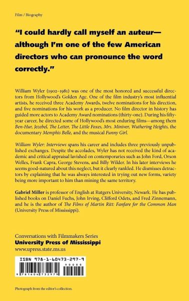 William Wyler (1902-1981) was one of the most honored and successful directors from Hollywood's Golden Age. One of the film industry's most influential artists, he received three Academy Awards, twelve nominations for his direction, and five nominations for his work as a producer. No film director in history has guided more actors to Academy Award nominations (thirty-one). During his fifty-year career, he directed some of Hollywood's most enduring films-among them Ben-Hur, Jezebel, The Letter, The Little Foxes, Mrs. Miniver, Wuthering Heights, the documentary Memphis Belle, and the musical Funny Girl. William Wyler: Interviews spans his career and includes three previously unpublished exchanges. Despite the accolades, Wyler has not received the kind of academic and critical appraisal lavished on contemporaries such as John Ford, Orson Welles, Frank Capra, George Stevens, and Billy Wilder. In his later interviews he seems good-natured about this neglect, but it clearly rankled. He dismisses detractors by explaining that he was always interested in trying out new forms, variety being more important to him than mining the same territory. Gabriel Miller is professor of English at Rutgers University, Newark. He has published books on Daniel Fuchs, John Irving, Clifford Odets, and Fred Zinnemann, and he is the author of The Films of Martin Ritt: Fanfare for the Common Man (University Press of Mississippi).