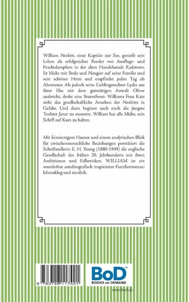 William Nesbitt, einst Kapitän zur See, genießt sein Leben als erfolgreicher Reeder von Ausflugs- und Frachtdampfern in der alten Handelsstadt Radstowe. Als jedoch seine Lieblingstochter Lydia aus ihrer Ehe mit dem gutmütigen Anwalt Oliver ausbricht, droht eine Sturmfront: Williams Frau Kate sieht das gesellschaftliche Ansehen der gesamten Familie in Gefahr. Und dann beginnt auch noch die jüngste Tochter Janet zu meutern. William hat alle Mühe, sein Schiff auf Kurs zu halten.Mit feinsinnigem Humor und einem Blick für zwischenmenschliche Beziehungen porträtiert die Schriftstellerin E. H. Young (1880-1949) die englische Gesellschaft des frühen 20. Jahrhunderts mit ihren Ambitionen und Fallstricken und setzt ihrem Vater als Titelfigur zugleich ein sehr persönliches literarisches Denkmal. WILLIAM ist ein wunderbar autobiografisch inspirierter Familienroman: lebensklug und sinnlich.