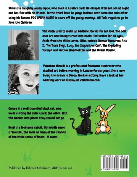 Willie is a naughty young hippo, who lives in a safari park. He escapes from his pen at night and has fun with his friends. In this third book he plays football with some lion cubs after using his famous POO SPRAY ALERT to scare off the pesky monkeys. All Ted's royalties go to Save the Children. The black and white colouring pages at the back can be photo-copied for multiple use by families.