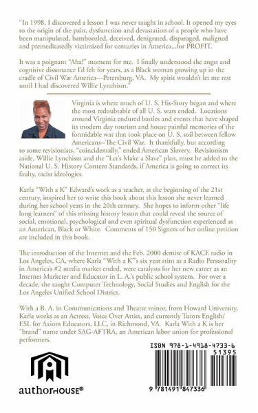 "In 1998, I discovered a lesson I was never taught in school. It opened my eyes to the origin of the pain, dysfunction and devastation of a people who have been manipulated, bamboozled, deceived, denigrated, disparaged, maligned and premeditatedly victimized for centuries in America...for PROFIT. It was a poignant "Aha!" moment for me. I finally understood the angst and cognitive dissonance I'd felt for years, as a Black woman growing up in the cradle of Civil War America---Petersburg, VA. My spirit wouldn't let me rest until I had discovered Willie Lynchism." Virginia is where much of U. S. His-Story began and where the most redoubtable of all U. S. wars ended. Locations around Virginia endured battles and events that have shaped its modern day tourism and house painful memories of the formidable war that took place on U. S. soil between fellow Americans--The Civil War. It thankfully, but according to some revisionists, "coincidentally," ended American Slavery. Revisionism aside, Willie Lynchism and the "Let's Make a Slave" plan, must be added to the National U. S. History Content Standards, if America is going to correct its faulty, racist ideologies.