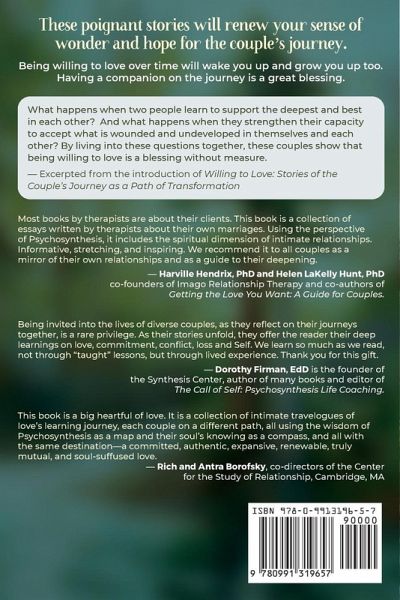 Nourish and renew your sense of wonder and hope for the couple's journey! This unique book is a collection of love stories written by experienced therapists about their own committed relationships. All the writers have been influenced by Psychosynthesis, an approach to psychological and spiritual development. With candor, warmth, and humor, each writer welcomes us into an intimate landscape where the creative work of building an enlivening and enduring relationship unfolds. Each story addresses the challenges the couple navigates along the way. Each one also describes the joys, sorrows and accomplishments both partners experience as their relationship deepens over time. In their vibrant interweaving of the difficulties and the sweetness of life partnership, these stories will inspire anyone who is part of a couple or wants to be. With commentary by noted Psychosynthesis authors Piero Ferrucci, Molly Brown and Thomas Yeomans. Visit www.willingtolovebook.com for video interviews and educational materials.
