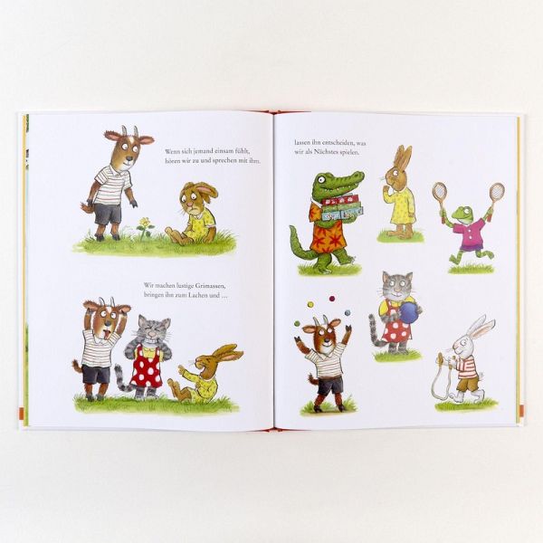 In diesem Buch über Freundschaft ist jeder herzlich willkommen - egal, ob groß oder klein, ob er hüpft oder flattert! Hauptsache, wir spielen und lachen zusammen, teilen unsere liebsten Dinge, trösten und vertragen uns wieder. Manchmal reichen schon kleine Gesten, wie jemanden an die Pfote zu nehmen, damit sich jeder angenommen fühlt. Ein eindrucksvolles Buch zum wichtigsten Thema der Welt - Freundschaft. Mit vielen klugen und komischen Bildern von Axel Scheffler, der hier auf seine ganz unnachahmliche Weise ein Plädoyer für eine freundliche Welt schafft. »Für eine glückliche Welt brauchen wir alle!«