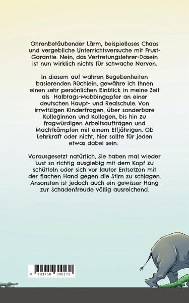 Ohrenbetäubender Lärm, beispielloses Chaos und vergebliche Unterrichtsversuche mit Frust-Garantie. Nein, das Vertretungslehrer-Dasein ist nun wirklich nichts für schwache Nerven.In diesem auf wahren Begebenheiten basierenden Büchlein, gewähre ich Ihnen einen sehr persönlichen Einblick in meine Zeit als Halbtags-Mobbingopfer an einer deutschen Haupt- und Realschule. Von irrwitzigen Kinderfragen, über sonderbare Kolleginnen und Kollegen, bis hin zu fragwürdigen Arbeitsaufträgen und Machtkämpfen mit einem Elfjährigen. Ob Lehrkraft oder nicht, hier sollte für jeden etwas dabei sein. Vorausgesetzt natürlich, Sie haben mal wieder Lust so richtig ausgiebig mit dem Kopf zu schütteln oder sich vor lauter Entsetzen mit der flachen Hand gegen die Stirn zu schlagen. Ansonsten ist jedoch auch ein gewisser Hang zur Schadenfreude völlig ausreichend.