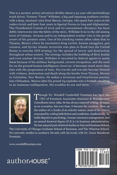 Trenton "Trent" Willobee, a semi-truck driver and resident of Oatman, Arizona, who originally hailed from Macon, Georgia, is recruited by federal agents to assist them with the interdiction of drug cartels, gun runners, human smugglers, and Syrian Islamic terrorists who are pouring over the U.S. border at Tijuana, Mexico. As a former Special Forces Soldier (SFS) and trucker, he is uniquely qualified to collect on the ground intelligence for federal agencies, because one of his trucking routes often takes him to Tijuana. As time passed, his involvement grew well beyond the original scope of his expected involvement. He found himself faced with numerous treacherous and dangerous situations from Tijuana to Chihuahua City, Mexico. Interwoven into the action, adventure, and suspense is an account of the 2016 Presidential Election. With all the danger going on in his life, Trent still finds time for a romantic relationship with, Haylee Harper, a waitress at the Olive Hotel Restaurant and Bar in Oatman. He says he doesn’t look for trouble, but doesn’t run from it, whether at home or on the road. Since he is a big man, 6'4" and 230 pounds, it would seem that he would be intimidating, but rather, he was often underestimated partially because of his unique southern-western drawl, which often confounded those with whom he had contact.