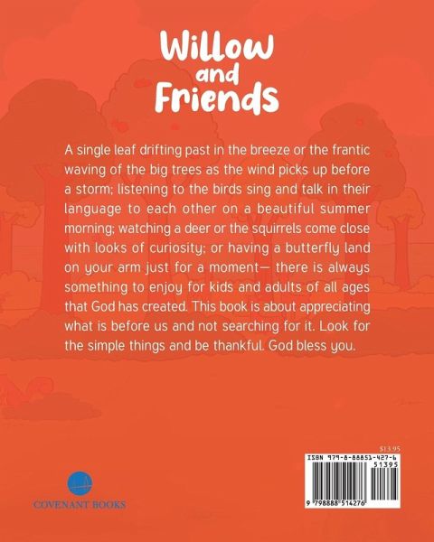 A single leaf drifting past in the breeze or the frantic waving of the big trees as the wind picks up before a storm; listening to the birds sing and talk in their language to each other on a beautiful summer morning; watching a deer or the squirrels come close with looks of curiosity; or having a butterfly land on your arm just for a moment-- there is always something to enjoy for kids and adults of all ages that God has created. This book is about appreciating what is before us and not searching for it. Look for the simple things and be thankful. God bless you.