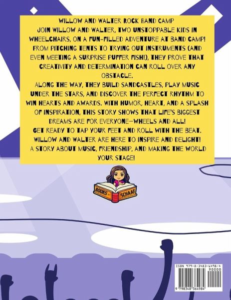 ¿¿¿¿ Willow and Walter Rock Band Camp ¿¿¿¿ Join Willow and Walter, two unstoppable kids in wheelchairs, on a fun-filled adventure at band camp! From pitching tents to trying out instruments (and even meeting a surprise puffer fish!), they prove that creativity and determination can roll over any obstacle. Along the way, they build sandcastles, play music under the stars, and discover the perfect rhythm to win hearts and awards. With humor, heart, and a splash of inspiration, this story shows that life's biggest dreams are for everyone-wheels and all! Get ready to tap your feet and roll with the beat. Willow and Walter are here to inspire and delight! ¿ A story about music, friendship, and making the world your stage! ¿