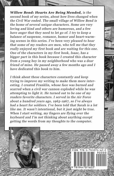 Willow Bend: Hearts Are Being Mended, is the second book of my series, about how lives changed when the Civil War ended. The small village of Willow Bend is the home of several unique characters. Some are very loving and kind and others are humorous, and a few have anger that they need to let go of. I try to keep a balance of suspense, romance, humor and heart-warming scenes in this series. I’ve been very pleased to hear that some of my readers are men, who tell me that they really enjoyed my first book and are waiting for this one. One of the characters in my first book, Isaac, has a bigger part in this book because I created this character from a young boy in my neighborhood who was a dear friend of mine. He passed away a few months ago and I have dedicated this book to him. I think about these characters constantly and keep trying to improve my writing to make them more interesting. I created Franklin, whose face was burned and scarred when a civil war cannon exploded while he was attempting to light it. He turned out to be one of my readers favorite characters. I served in the Air Force about a hundred years ago, 1963-1967, so I’ve always had a heart for soldiers. I’ve been told that Sarah is a lot like me. It wasn’t intentional, but it just might be true. When I start writing, my fingers are flying over the keyboard and I’m not thinking about anything except getting the words from my thoughts to the computer.