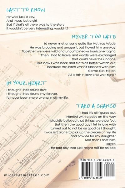 Last To Know He was just a boy. And I was just a girl. But if that’s all there was to the story it wouldn’t be very interesting, would it? Never Too Late I’d never met anyone quite like Mathias Wade. He was brooding and arrogant, but I loved him anyway. Together we were wild and uncontained—a hurricane raging. Then I had to leave, and words were exchanged that could never be undone. But now I was back, and Mathias better watch out, because this bitch wasn’t finished with him. Game. Set. Match. All is fair in love and war, right? In Your Heart I thought I had found love. I thought I had found my forever. I’d never been more wrong in all my life. Take A Chance I had life all figured out. Married with a baby on the way I stupidly believed that things were perfect. But then the good guy I fell in love with turned out to not be as good as I thought. I was left alone to pick up the pieces of my life and provide for my daughter. And then I met him. Hayes. The bad boy that just might not be so bad. Also includes 26,000 words of EXCLUSIVE bonus material