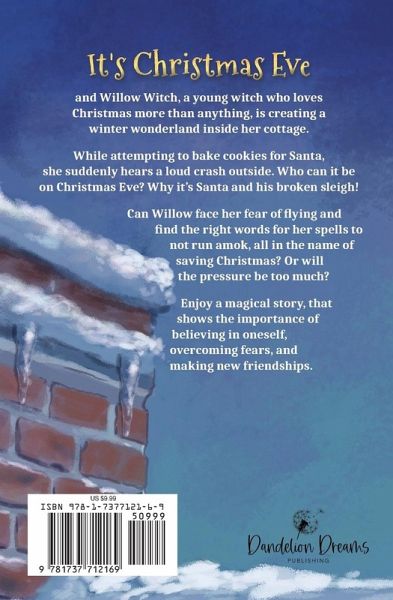 It's Christmas Eve and Willow Witch, a young witch who loves Christmas more than anything, is creating a winter wonderland inside her cottage. While attempting to bake cookies for Santa, she suddenly hears a loud crash outside. Who can it be on Christmas Eve? Why it's Santa and his broken sleigh! Can Willow face her fear of flying and find the right words for her spells to not run amok, all in the name of saving Christmas? Or will the pressure be too much? Enjoy a magical story showing the importance of believing in oneself, overcoming fears, and making new friendships.
