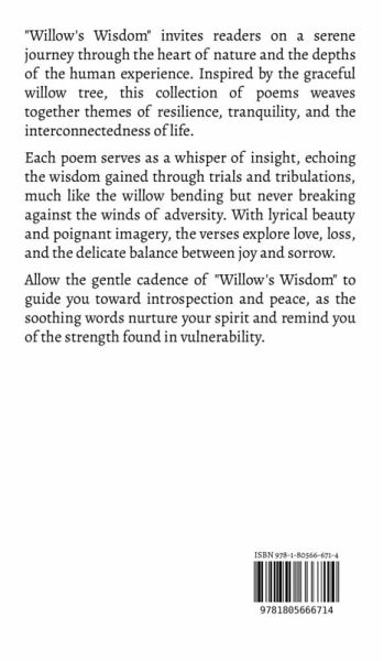 "Willow's Wisdom" invites readers on a serene journey through the heart of nature and the depths of the human experience. Inspired by the graceful willow tree, this collection of poems weaves together themes of resilience, tranquility, and the interconnectedness of life. Each poem serves as a whisper of insight, echoing the wisdom gained through trials and tribulations, much like the willow bending but never breaking against the winds of adversity. With lyrical beauty and poignant imagery, the verses explore love, loss, and the delicate balance between joy and sorrow. Allow the gentle cadence of "Willow's Wisdom" to guide you toward introspection and peace, as the soothing words nurture your spirit and remind you of the strength found in vulnerability.