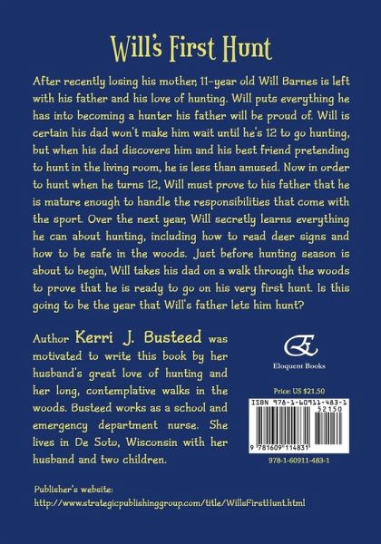 After recently losing his mother, 11-year old Will Barnes is left with his father and his love of hunting. Will puts everything he has into becoming a hunter his father will be proud of. Will is certain his dad won't make him wait until he's 12 to go hunting, but when his dad discovers him and his best friend pretending to hunt in the living room, he is less than amused. Now in order to hunt when he turns 12, Will must prove to his father that he is mature enough to handle the responsibilities that come with the sport. Over the next year, Will secretly learns everything he can about hunting, including how to read deer signs and how to be safe in the woods. Just before hunting season is about to begin, Will takes his dad on a walk through the woods to prove that he is ready to go on his very first hunt. Is this going to be the year that Will's father lets him hunt? Author Kerri J. Busteed was motivated to write this book by her husband's great love of hunting and her long, contemplative walks in the woods. Busteed works as a school and emergency department nurse. She lives in De Soto, Wisconsin with her husband and two children. Publisher's website: http://www.strategicpublishinggroup.com/title/WillsFirstHunt.html