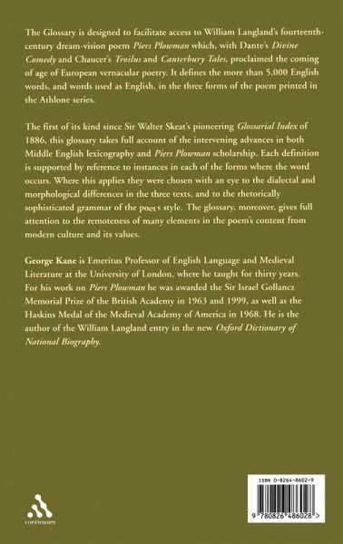 This Glossary is designed as a companion to William Langland's dream vision poem, Piers Plowman, widely regarded as the greatest literary work in Middle English before Chaucer. It glosses and explains over 5000 English words, and foreign words used as if English, in the A, B and C texts of Piers Plowman printed in the critically-acclaimed Athlone editions. Where possible, it illustrates words with examples from all three versions. The first glossary to Piers Plowman was compiled in 1886 by Sir William Skeat but there has been no attempt, until now, to provide a new glossary that takes account of the considerable advances in Middle English scholarship over the last century. This new Glossary gives particular attention to the distinctive problems inherent in its subject, how the texts were preserved, written and received in their time. It takes account of the dialectical and morphological variations between the three texts; the grammar of Langland's style; the richly figurative texture of the rhetorical language used in the poem; and the remoteness of many elements in its content from modern culture and its values.