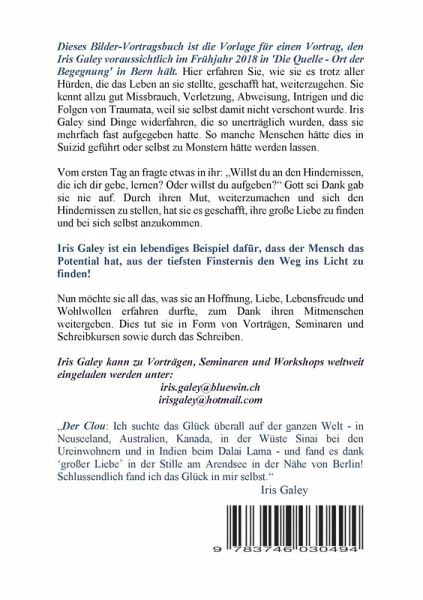 Dieses Bilder-Vortragsbuch ist die Vorlage für einen Vortrag, den Iris Galey im Frühjahr 2018 in 'Die Quelle - Ort der Begegnung' in Bern hält. Hier erfahren Sie, wie sie es trotz aller Hürden, die das Leben an sie stellte, geschafft hat, weiterzugehen. Sie kennt allzu gut Missbrauch, Verletzung, Abweisung, Intrigen und die Folgen von Traumata, weil sie selbst damit nicht verschont wurde. Iris Galey sind Dinge widerfahren, die so unerträglich wurden, dass sie mehrfach fast aufgegeben hatte. So manche Menschen hätte dies in Suizid geführt oder selbst zu Monstern hätte werden lassen.Vom ersten Tag an fragte etwas in ihr: 'Willst du an den Hindernissen, die ich dir gebe, lernen? Oder willst du aufgeben?' Gott sei Dank gab sie nie auf. Durch ihren Mut, weiterzumachen und sich den Hindernissen zu stellen, hat sie es geschafft, ihre große Liebe zu finden und bei sich selbst anzukommen.Iris Galey ist ein lebendiges Beispiel dafür, dass der Mensch das Potential hat, aus der tiefsten Finsternis den Weg ins Licht zu finden! Nun möchte sie all das, was sie an Hoffnung, Liebe, Lebensfreude und Wohlwollen erfahren durfte, zum Dank ihren Mitmenschen weitergeben. Dies tut sie in Form von Vorträgen, Seminaren und Schreibkursen sowie durch das Schreiben.Iris Galey kann zu Vorträgen, Seminaren und Workshops weltweit eingeladen werden.