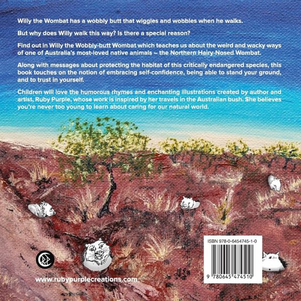 Ruby Purple (R) has had a love of the arts since her youth. From humble beginnings, Ruby has had hundreds of exhibitions and travelled the globe showcasing her work. With her first children's book, Rue the Curious Emu being so well received, she extends her creativity to a second release, Willy the Wobbly-butt Wombat.Ruby travels into the Australian bush, camping along the way to explore the vast landscapes and get a real feel for the land and those who live upon it, which she draws on to create her abstract paintings and children's books.She feels very privileged and remains grateful for the opportunity to do what she does, sharing her knowledge and her message about caring for our natural world.Keep an eye out for 'What's Ruby doing?' on Instagram @rubypurplecreations