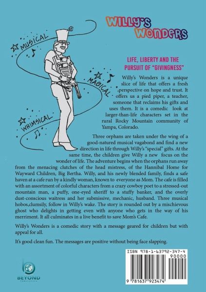 LIFE, LIBERTY AND THE PURSUIT OF "GIVINGNESS" Willy's Wonders is a unique slice of life that offers a fresh perspective on hope and trust. It offers us a pied piper, a teacher, someone that reclaims his gifts and uses them. It is a comedic look at larger-than-life characters set in the rural Rocky Mountain community of Yampa, Colorado. Three orphans are taken under the wing of a good-natured musical vagabond and find a new direction in life through Willy's "special" gifts. At the same time, the children give Willy a new focus on the wonder of life. The adventure begins when the orphans run away from the menacing clutches of the headmistress, of the Hannibal Home for Wayward Children, Big Bertha. Willy, and his newly blended family, find a safe haven at a cafe run by a kindly woman, known to everyone as Mom. The cafe is filled with an assortment of colorful characters from a crazy cowboy poet to a stressed-out mountain man, a puffy, one-eyed sheriff to a stuffy banker, and the overly dust-conscious waitress and her submissive, mechanic, husband. Three musical hobos, clumsily, follow in Willy's wake. The story is rounded out by a mischievous ghost who delights in getting even with anyone who gets in the way of his merriment. It all culminates in a live benefit to save Mom's Cafe. Willy's Wonders is a comedic story with a message geared for children but with appeal for all. It's good clean fun. The messages are positive without being face slapping.