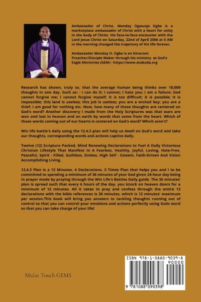 Research has shown, truly so, that the average human being thinks over 10,000 thoughts in one day. Such as: - I can do it; I cannot; I hate you; I am a failure; God cannot forgive me; I cannot forgive myself; It is too difficult; it is possible; it is impossible; this land is useless; this job is useless; you are a wicked boy; you are a thief; I am good for nothing etc. Now, how many of those thoughts are centered on God's word? Another discovery I made from the Holy Scriptures was that wars are won and lost in heaven and on earth by words that come from the heart. Which of those words coming out of our hearts is centered on God's word? Which aren't? Win life battle's daily using the 12.4.3 plan will help us dwell on God's word and take our thoughts, corresponding words and actions captive daily. Twelve (12) Scripture Packed, Mind Renewing Declarations to Fuel A Daily Victorious Christian Lifestyle That Manifest In A Fearless, Healthy, Joyful, Loving, Hate-Free, Peaceful, Spirit - Filled, Guiltless, Sinless, High Self - Esteem, Faith-Driven And Vision Accomplishing Living. 12.4.3 Plan is a 12 Minutes. 4 Declarations. 3 Times Plan that helps you and I to be committed to spending a minimum of 36 minutes of your God given 24-hour day being in prayer mode by praying through the Win Life's Battles Daily guide. The 36 minutes' plan is spread such that every 6 hours of the day, you knock on heaven doors for a minimum of 12 minutes. All it takes to pray and confess through the entire 12 declarations with the bible references is 36 minutes, which is 12 minutes' maximum per session. This book will bring you answers to tackling thoughts running out of control so that you can control your emotions and actions perfectly using Gods word so that you can take charge of your life!