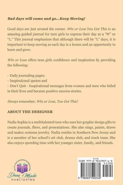Bad days will come and go...Keep Moving! Good days are just around the corner. Win or Lose You Got This is an amazing guided journal for teen girls to express their day as a "W" or "L." This journal emphasizes that although there will be "L" days, it is important to keep moving as each day is a lesson and an opportunity to learn and grow. Win or Lose offers teen girls confidence and inspiration by providing the following: Daily journaling pages; Inspirational quotes and Don't Quit - Inspirational messages from women and men who failed in their lives and became positive success stories. Always remember, Win or Lose, You Got This!