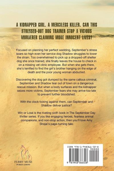 "Colorful characters, including the unusual perspective of Shadow the dog, make this series an enjoyable read for any animal lover." ~Toby Neal, USA TODAY Bestselling Author of the Paradise Crime Mysteries & Thrillers A kidnapped girl. A merciless killer. Can this stressed-out dog trainer stop a callous murderer claiming innocent lives? September Day can't shake her mounting wedding-planning angst. Too overwhelmed to pick up a dropped-off shelter dog she once trained, she finally leaves the house to check in on a missing vet clinic employee. But when she gets there, she's terrified to find the girl's brother hanging on the edge of death and the poor young woman abducted. Discovering the hound got dumped by the same vicious criminal, September and Shadow race out of town on a dangerous rescue mission. But when a body surfaces and the kidnapper seizes more victims, September fears she may be too late to prevent further bloodshed. With the clock ticking against them, can September and Shadow deliver justice? Win or Lose is the riveting sixth book in The September Day thriller series. If you like engaging heroes, fearless animal companions, and non-stop action, then you'll love Amy Shojai's page-turning tale. Buy Win or Lose to play a deadly game today!