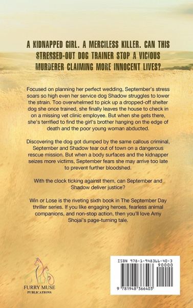 "Colorful characters, including the unusual perspective of Shadow the dog, make this series an enjoyable read for any animal lover." ~Toby Neal, USA TODAY Bestselling Author of the Paradise Crime Mysteries & Thrillers A kidnapped girl. A merciless killer. Can this stressed-out dog trainer stop a callous murderer claiming innocent lives? September Day can't shake her mounting wedding-planning angst. Too overwhelmed to pick up a dropped-off shelter dog she once trained, she finally leaves the house to check in on a missing vet clinic employee. But when she gets there, she's terrified to find the girl's brother hanging on the edge of death and the poor young woman abducted. Discovering the hound got dumped by the same vicious criminal, September and Shadow race out of town on a dangerous rescue mission. But when a body surfaces and the kidnapper seizes more victims, September fears she may be too late to prevent further bloodshed. With the clock ticking against them, can September and Shadow deliver justice? Win or Lose is the riveting sixth book in The September Day thriller series. If you like engaging heroes, fearless animal companions, and non-stop action, then you'll love Amy Shojai's page-turning tale. Buy Win or Lose to play a deadly game today!