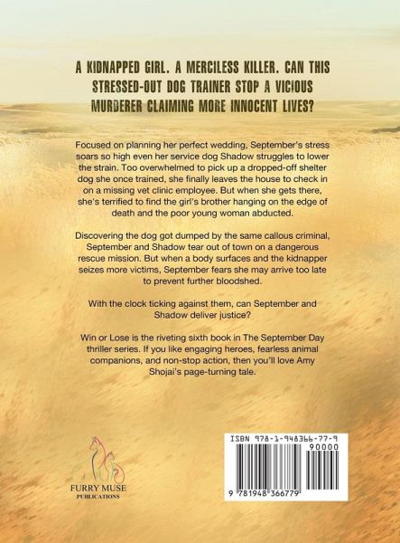 LARGE PRINT EDITION "Colorful characters, including the unusual perspective of Shadow the dog, make this series an enjoyable read for any animal lover." ~Toby Neal, USA TODAY Bestselling Author of the Paradise Crime Mysteries & Thrillers A kidnapped girl. A merciless killer. Can this stressed-out dog trainer stop a callous murderer claiming innocent lives? September Day can't shake her mounting wedding-planning angst. Too overwhelmed to pick up a dropped-off shelter dog she once trained, she finally leaves the house to check in on a missing vet clinic employee. But when she gets there, she's terrified to find the girl's brother hanging on the edge of death and the poor young woman abducted. Discovering the hound got dumped by the same vicious criminal, September and Shadow race out of town on a dangerous rescue mission. But when a body surfaces and the kidnapper seizes more victims, September fears she may be too late to prevent further bloodshed. With the clock ticking against them, can September and Shadow deliver justice? Win or Lose is the riveting sixth book in The September Day thriller series. If you like engaging heroes, fearless animal companions, and non-stop action, then you'll love Amy Shojai's page-turning tale. Buy Win or Lose to play a deadly game today!