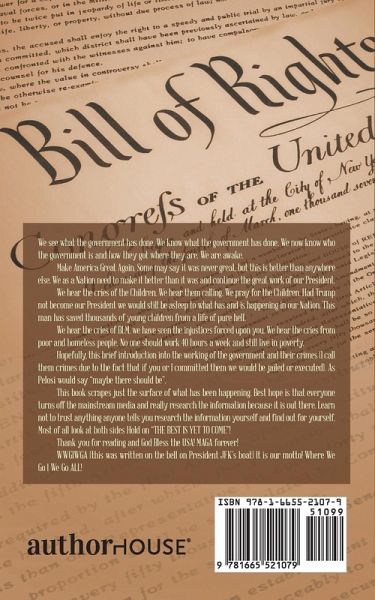 We see what the government has done. We know what the government has done. We now know who the government is and how they got where they are. We are awake. Make America Great Again. Some may say it was never great, but this is better than anywhere else. We as a Nation need to make it better than it was and continue the great work of our President. We hear the cries of the Children. We hear them calling. We pray for the Children. Had Trump not become our President we would still be asleep to what has and is happening in our Nation. This man has saved thousands of young children from a life of pure hell. We hear the cries of BLM, we have seen the injustices forced upon you. We hear the cries from poor and homeless people. No one should work 40 hours a week and still live in poverty. Hopefully, this brief introduction into the working of the government and their crimes (I call them crimes due to the fact that if you or I committed them we would be jailed or executed). As Pelosi would say "maybe there should be". This book scrapes just the surface of what has been happening. Best hope is that everyone turns off the mainstream media and really research the information because it is out there. Learn not to trust anything anyone tells you research the information yourself and find out for yourself. Most of all look at both sides Hold on "THE BEST IS YET TO COME"! Thank you for reading and God Bless the USA! MAGA forever! WWG1WGA (this was written on the bell on President JFK's boat) It is our motto! Where We Go 1 We Go ALL!