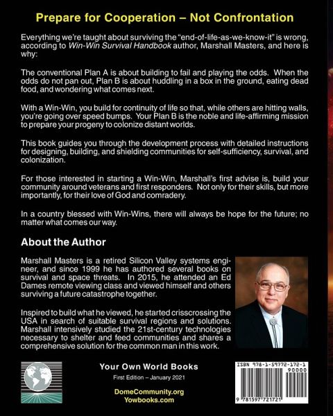 Prepare for Cooperation - Not Confrontation With a Win-Win, you build for continuity of life so that, while others are hitting walls, you're going over speed bumps. Your Plan B is the noble and life-affirming mission to prepare your progeny to colonize distant worlds. This book guides you through the development process with detailed instructions for designing, building, and shielding communities for self-sufficiency, survival, and colonization. For those interested in starting a Win-Win, Marshall's first advice is, build your community around veterans and first responders. Not only for their skills but, more importantly, for their love of God and fellowship. There is hope for the future in a country blessed with Win-Wins, no matter what comes our way.