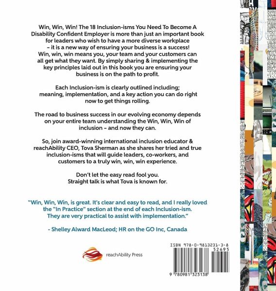 Win, Win, Win! The 18 Inclusion-isms You Need to Become a Disability Confident Employer is more than just an important book for leaders who wish to have a more diverse workplace-it is a new way of ensuring your business is a success! Win, win, win means you, your team and your customers can all get what they want (and need). By simply sharing & implementing the key principles laid out in this book you are ensuring your business is on the path to profit. Each Inclusion-ism is clearly outlined including; meaning, implementation, and an "in practice" action you can do right now to get things rolling. The road to business success in our evolving economy depends on your entire team understanding the win, win, win of inclusion - and now they can. So, join award-winning international inclusion educator & reachAbility CEO, Tova Sherman as she shares her tried and true inclusion-isms that will guide leaders, co-workers, and customers to a truly win, win, win experience. Don't let the easy read fool you-straight talk is what Tova is known for. "Win, Win, Win, is great. It's clear and easy to read, and I really loved the "In Practice" section at the end of each Inclusion-ism. They are very practical actions to assist with implementation." - Shelley Alward MacLeod; HR on the GO Inc, Canada