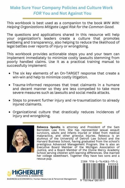 Make Sure Your Company Policies and Culture Work For You and Not Against You This workbook is best used as a companion to the book WIN WIN: Helping Organizations Mitigate Legal Risk for the Common Good. The questions and applications shared in this resource will help your organization's leaders create a culture that promotes wellbeing and transparency, also helping to reduce the likelihood of legal battles over reports of injury or wrongdoing. This workbook provides actionable steps you and your team can implement immediately to minimize costly lawsuits stemming from poorly handled claims. Use it as a practical training manual to successfully implement: The six key elements of an On-TARGET response that create a win-win and help to minimize litigation. Trauma-informed responses that treat claimants in a humane and decent manner so they are less compelled to take more severe measures such as lawsuits and social media attacks. Steps to prevent further injury and re-traumatization to already injured claimants. Organizational culture that drastically reduces incidents of injury and wrongdoing.
