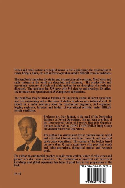 The book is a civil engineering handbook on winch and cable systems. The handbook may be used as textbook for university studies in civil engineering and forestry and as the basis for studies in schools on a technical level. It should be a useful reference book for construction engineers, civil engineers, logging engineers, foresters and leaders of operational activities under difficult terrain conditions. The content in the book is based on more than 35 years experience with practical winch and cable operations. As a leader of the Norwegian Institute of Forest Operations, the author has carried out research work in this field since 1947. The Institute is the owner of yarders, winches, cable cranes etc., and with its own cable crews the Institute operates as a contractor in its own research forests as well as in other state or privately owned forests throughout Norway. The research work also includes other cable crane operations in Norway and other countries. As the leader of theJoint FAO/ECE/ILO Study Group on Mechanized Forest Operations the author studied cable operations in most of the Eastern and Western European countries. As president of the International Union of Forestry Research Organizations the author visited most forest countries in the world. Information from research and practical cable crane operations were collected. The handbook is based on material on winch and cable systems used in Japan, New Zealand, Soviet Union, Central Europe, Northern Europe, Eastern United States, Western United States and British Columbia.