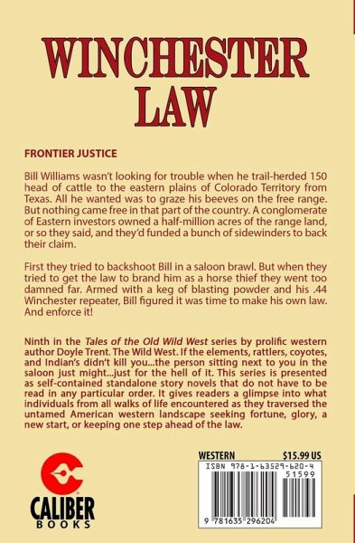 Ninth in the Tales of the Old Wild West series by prolific western author Doyle Trent. In the tradition of the John Wayne classic western films and legendary television series of Gunsmoke and Bonanza. The Wild West. If the elements, rattlers, coyotes, and Indian's didn't kill you...the person sitting next to you in the saloon just might...just for the hell of it. This series is presented as self-contained standalone story novels that do not have to be read in any particular order. It gives readers an entertaining glimpse into what individuals from all walks of life encountered as they traversed the untamed western landscape seeking fortune, glory, a new start, or keeping one step ahead of the law behind them. FRONTIER JUSTICE Bill Williams wasn't looking for trouble when he trail-herded 150 head of cattle to the eastern plains of Colorado Territory from Texas. All he wanted was to graze his beeves on the free range. But nothing came free in that part of the country. A conglomerate of Eastern investors owned a half-million acres of the range land, or so they said, and they'd funded a bunch of sidewinders to back their claim. First they tried to backshoot Bill in a saloon brawl. But when they tried to get the law to brand him as a horse thief they went too damned far. Armed with a keg of blasting powder and his .44 Winchester repeater, Bill figured it was time to make his own law. And enforce it!
