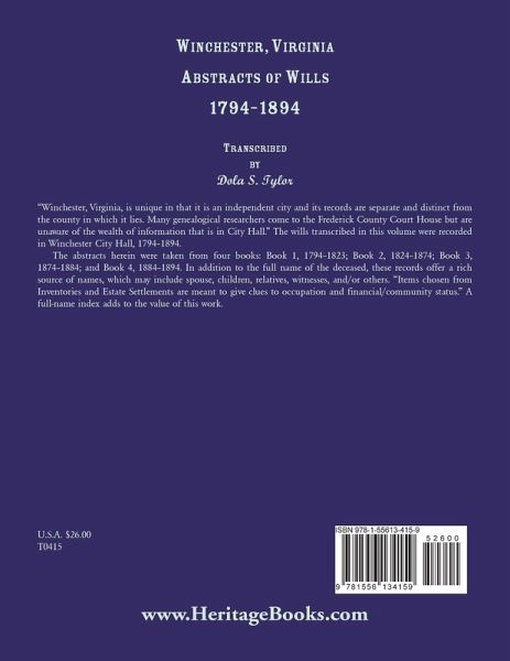 "Winchester, Virginia, is unique in that it is an independent city and its records are separate and distinct from the county in which it lies. Many genealogical researchers come to the Frederick County Court House but are unaware of the wealth of information that is in City Hall." The wills transcribed in this volume were recorded in Winchester City Hall, 1794-1894. The abstracts herein were taken from four books: Book 1, 1794-1823; Book 2, 1824-1874; Book 3, 1874-1884; and Book 4, 1884-1894. In addition to the full name of the deceased, these records offer a rich source of names, which may include spouse, children, relatives, witnesses, and/or others. "Items chosen from Inventories and Estate Settlements are meant to give clues to occupation and financial/community status." A full-name index adds to the value of this work. (1990), 2020, 8¿x11, paper, index, 124 pp
