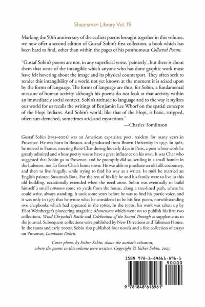 Marking the 50th anniversary of the earliest poems brought together in this volume, we now offer a second edition of Gustaf Sobin's first collection, a book which has been hard to find, other than within the pages of his posthumous Collected Poems. "Gustaf Sobin's poems are not, in any superficial sense, 'painterly', but there is about them that sense of the intangible which anyone who has done graphic work must have felt hovering about the image and its physical counterpart. They often seek to render this intangibility of a world not yet known at the moment it is seized upon by the forms of language. The forms of language are thus, for Sobin, a fundamental measure of human activity although his poems do not look at that activity within an immediately social context. Sobin's attitude to language and to the way it stylizes our world for us recalls the writings of Benjamin Lee Whorf on the spatial concepts of the Hopi Indians. And Sobin's world, like that of the Hopi, is basic, stripped, often sun-drenched, sometimes arid-and mysterious." -Charles Tomlinson