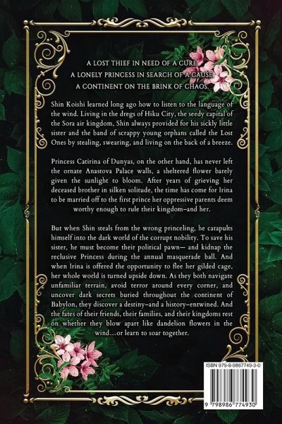 A lost thief in need of a cure. A lonely princess in search of a cause. A continent on the brink of chaos. Shin Koishi learned long ago how to listen to the language of the wind. Living in the dregs of Hiku City, the seedy capital of the Sora air kingdom, Shin always provided for his sickly little sister and the band of scrappy young orphans called the Lost Ones by stealing, swearing, and living on the back of a breeze. Princess Catirina of Dunyas, on the other hand, has never left the ornate Anastova Palace walls, a sheltered flower barely given the sunlight to bloom. After years of grieving her deceased brother in silken solitude, the time has come for Irina to be married off to the first prince her oppressive parents deem worthy enough to rule their kingdom-and her. But when Shin steals from the wrong princeling, he catapults himself into the dark world of the corrupt nobility. To save his sister, he must become their political pawn- and kidnap the reclusive Princess during the annual masquerade ball. And when Irina is offered the opportunity to flee her gilded cage, her whole world is turned upside down. As they both navigate unfamiliar terrain, avoid terror around every corner, and uncover dark secrets buried throughout the continent of Babylon, they discover a destiny-and a history-entwined. And the fates of their friends, their families, and their kingdoms rest on whether they blow apart like dandelion flowers in the wind...or learn to soar together.