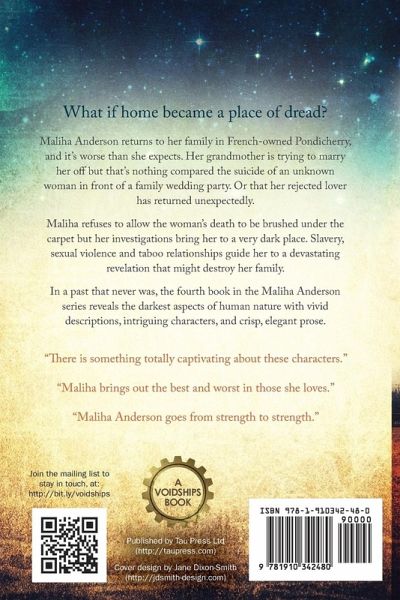 What if home became a place of dread? Maliha Anderson returns to her family in French-owned Pondicherry, and it's as bad as she expected. Her grandmother is trying to marry her off but that's nothing compared the suicide of an unknown woman in front of a family wedding party. Or that her rejected lover has returned unexpectedly. Maliha refuses to allow the woman's death to be brushed under the carpet but her investigations bring her to a very dark place. Slavery, sexual violence and taboo relationships guide her to a devastating revelation that might destroy her family. In a past that never was, the fourth book in the Maliha Anderson series reveals the darkest aspects of human nature with vivid descriptions, intriguing characters, and crisp, elegant prose.