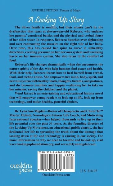 The Silver family is wealthy, but their money can't fix the dysfunction that tears at eleven-year-old Rebecca, who endures her parents' emotional battles and the physical and verbal abuse of her older sister. In response, Rebecca hunches over, tightening and over-contracting the muscles on the right side of her body. Over time, this has caused her spine to curve in unhealthy directions, creating pressure on her nervous system and wreaking havoc on her immune system. She also turns to the comfort of food. Rebecca's life changes dramatically when she encounters the nature spirits of the sky, who help humans find peace and health. With their help, Rebecca learns how to heal herself from verbal, food, and techno abuse. She empowers her mind, body, spirit, and nervous system with healthy foods, thoughts, breaths, and postures, and she becomes healthier and happier-allowing her to take on her mission: saving the children and the planet. Wind Kissed is an entertaining and educational fantasy novel that will empower young readers to look up at life, look up from technology, and make healthy, peaceful choices.